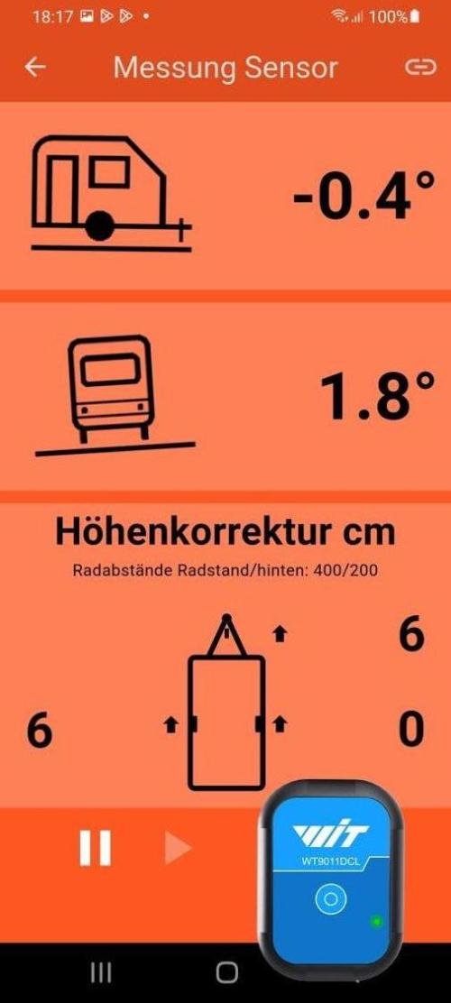 In den Varianten Level light und Level plus ist es möglich, neben den internen Winkel-Sensoren des Smartphones oder Tablets auch externe Winkel-Sensoren der Firma WitMotion über Bluetooth anzubinden. Diese übernehmen die Neigungsmessung des Fahrzeugs und können überall im Fahrzeug positioniert werden. So können Sie die Neigung direkt in Ihrem Smartphone oder Tablet schon beim Einparken von Fahrersitz aus bequem kontrollieren.